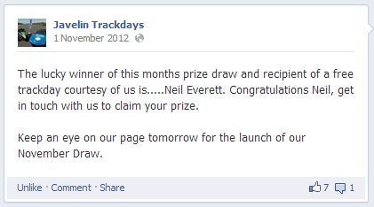 Cadwell Trackday 13th April 2013 In October 2012 I entered the monthly prize draw on the Javelin Trackdays Facebook page. Not normally one for entering competitions, this seemed easy enough to do (a few mouse clicks) so I went for it, never expecting to hear anything again. I was therefore surprised when this turned up on Facebook:
